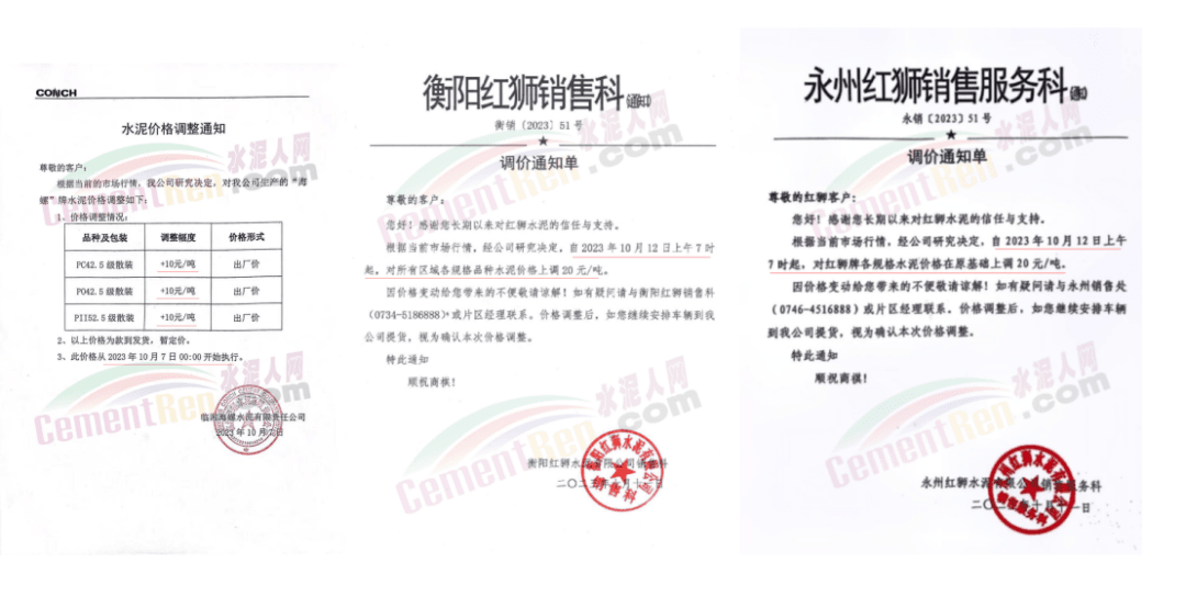 江西吉州南方水泥吉安青原區(qū)分公司通知,根據(jù)當(dāng)前市場行情,經(jīng)公司研究決定,自2023年10月15日8時起,各標(biāo)號水泥上調(diào)20元/噸。