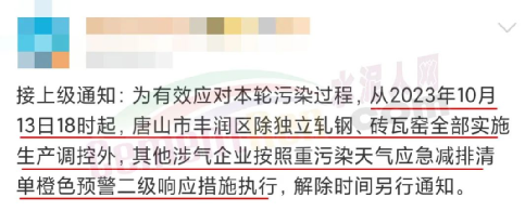 河北唐山區(qū)域通知,涉氣企業(yè)按照重污染天氣應(yīng)急減排清單橙色預(yù)警二級響應(yīng)措施執(zhí)行。