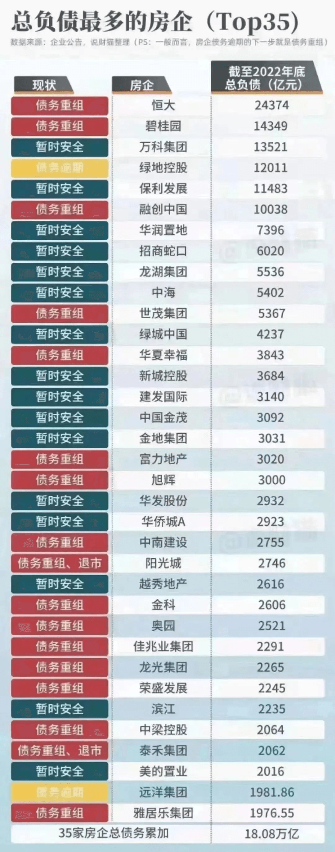 從碧桂園到融創(chuàng)再到綠地、華夏幸福、世茂地產(chǎn)、陽(yáng)光城,統(tǒng)計(jì)數(shù)據(jù)顯示,中國(guó)房企排名前100中,53家已暴雷或正處于暴雷邊緣,房企前30強(qiáng)已經(jīng)暴雷20家,不知下一家會(huì)是誰(shuí)。負(fù)債萬(wàn)億的房企有4家,分別為,恒大、碧桂園、萬(wàn)科、綠地控股,由此可見,就連一向以經(jīng)營(yíng)穩(wěn)健著稱的萬(wàn)科,目前也存在債務(wù)暴雷風(fēng)險(xiǎn)。