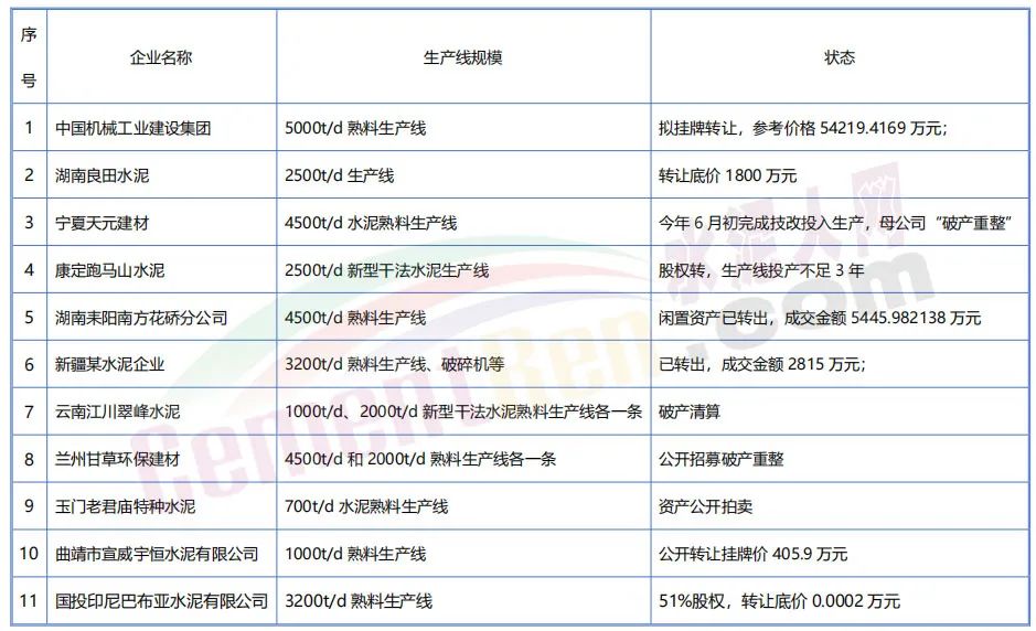 與此同時,多家水泥企業(yè)股權(quán)、指標(biāo)、設(shè)備資產(chǎn)登上拍賣平臺。其中不乏2500t/d及以上規(guī)格熟料生產(chǎn)線,甚至還包含5000t/d生產(chǎn)線。