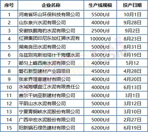 從目前各項目最新動態(tài)可見,部分在建項目已陸續(xù)點火投產(chǎn),另有部分已開工在建項目正加緊建設(shè)中。據(jù)不完全統(tǒng)計已投產(chǎn)的15個熟料項目,合計產(chǎn)能達(dá)2280萬噸/年;下半年將投產(chǎn)的5個項目合計產(chǎn)能達(dá)810萬噸/年,合計產(chǎn)能達(dá)3090萬噸/年。