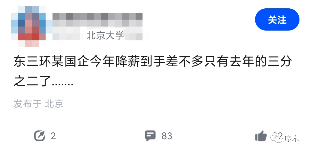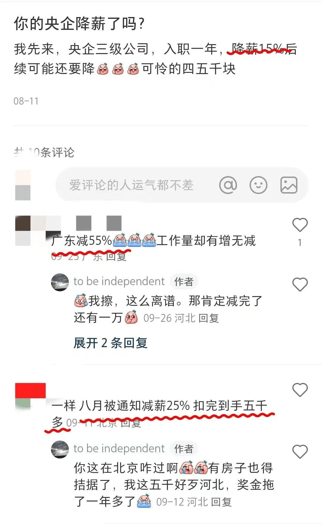 網(wǎng)友爆料說:某軍工央企,過完年開始部門考核,個(gè)人績(jī)效考核,完成當(dāng)月指標(biāo)情況下工資不變,未完成的績(jī)效低,工資降低。上個(gè)月非常多員工工資都少了,很多人到手六千多,也就是變相降薪的一種方式,本來就是996的工作強(qiáng)度,現(xiàn)在又開始變相降薪。“現(xiàn)在的國(guó)央企,員工能進(jìn)能出、領(lǐng)導(dǎo)能上能下、薪酬能增能減是標(biāo)配,人效提升是大勢(shì)所趨”。