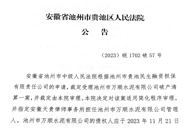 10月19日,安徽省池州市貴池區(qū)人民法院公告稱,安徽省池州市中級(jí)人民法院根據(jù)池州市貴池民生融資擔(dān)保有限責(zé)任公司的申請,裁定受理池州市萬順?biāo)嘤邢薰酒飘a(chǎn)清算一案。
