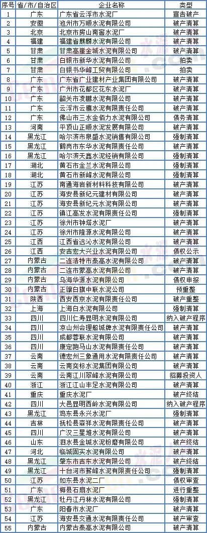 2023年1-10月期間55家水泥企業(yè)宣告破產(chǎn)