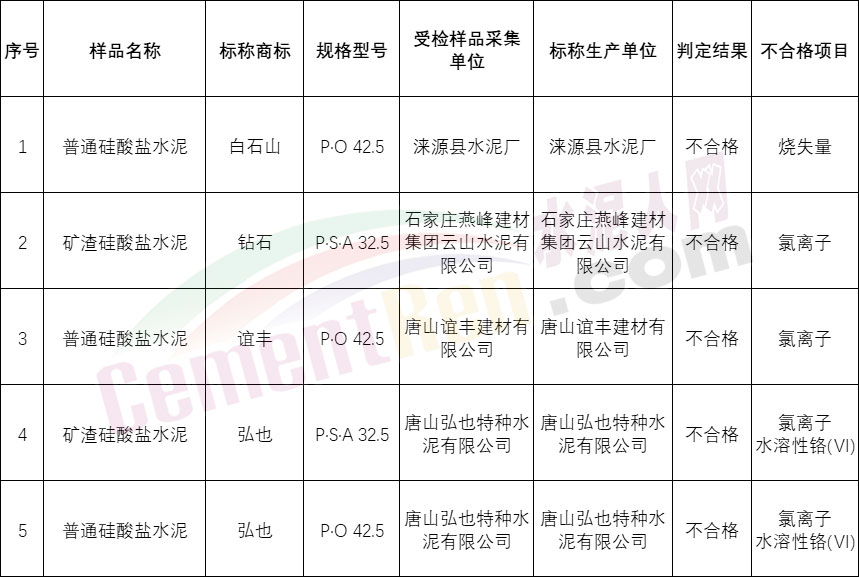 河北省市場監(jiān)管局為進一步加強我省產(chǎn)品質(zhì)量安全監(jiān)管,采取購買樣品方式,抽查檢測水泥等產(chǎn)品,檢出水泥不合格樣品5批次。