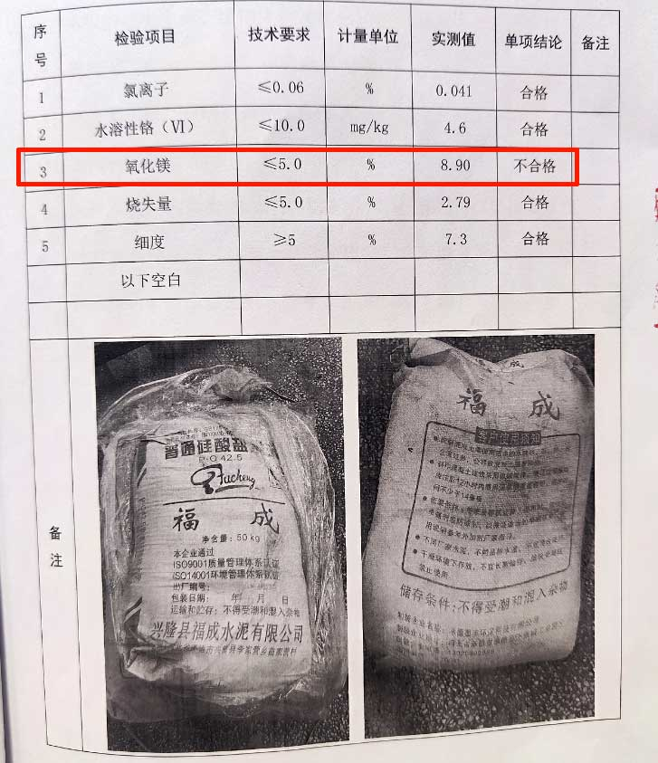 標稱生產(chǎn)企業(yè)為興隆縣福成水泥有限公司生產(chǎn)的一批次福成牌P.O42.5水泥,氧化鎂項目不合格。