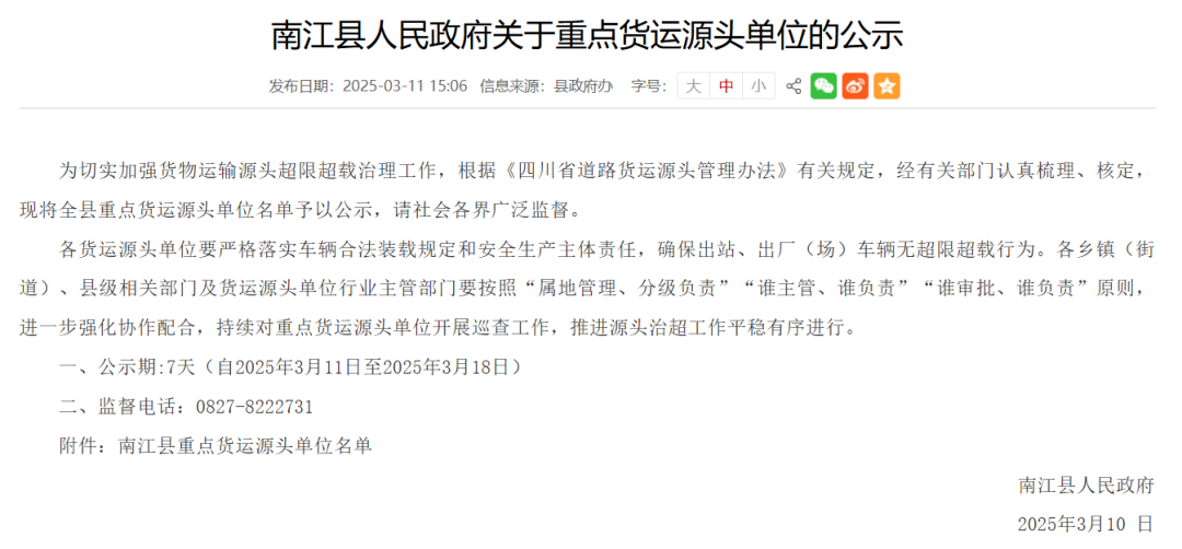 日前,南江縣人民政府發(fā)布關(guān)于重點(diǎn)貨運(yùn)源頭單位的公示稱,為切實(shí)加強(qiáng)貨物運(yùn)輸源頭超限超載治理工作,根據(jù)《四川省道路貨運(yùn)源頭管理辦法》有關(guān)規(guī)定,經(jīng)有關(guān)部門認(rèn)真梳理、核定,現(xiàn)將全縣重點(diǎn)貨運(yùn)源頭單位名單予以公示,請(qǐng)社會(huì)各界廣泛監(jiān)督。