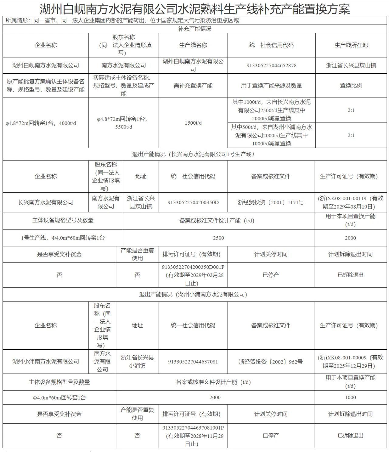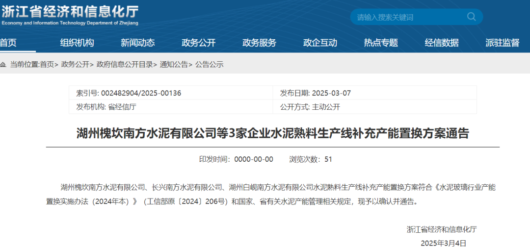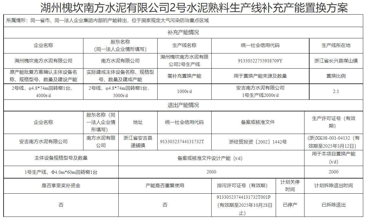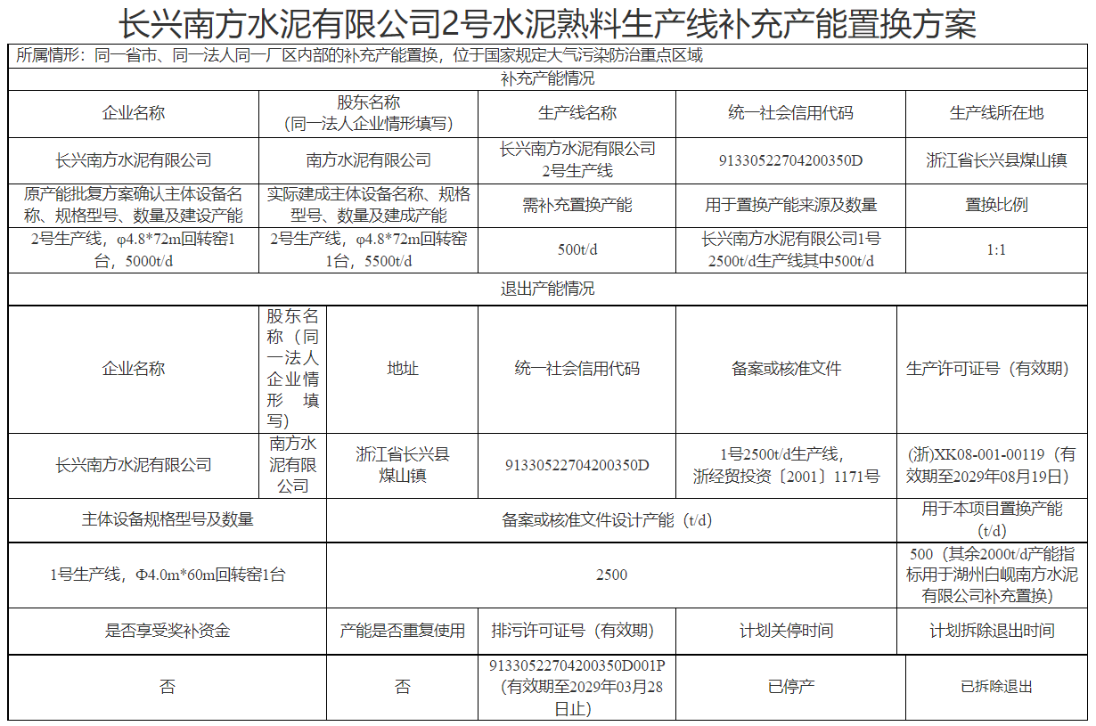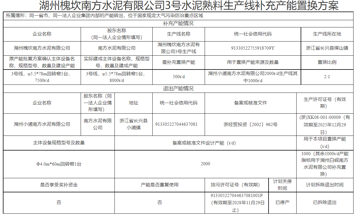 日前,浙江省經(jīng)信廳發(fā)布3家企業(yè)5條熟料生產(chǎn)線補充產(chǎn)能通告稱,湖州槐坎南方水泥有限公司、長興南方水泥有限公司、湖州白峴南方水泥有限公司水泥熟料生產(chǎn)線補充產(chǎn)能置換方案符合《水泥玻璃行業(yè)產(chǎn)能置換實施辦法(2024年本)》(工信部原〔2024〕206號)和國家、省有關水泥產(chǎn)能管理相關規(guī)定,現(xiàn)予以確認并通告。