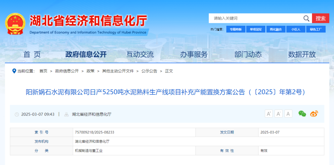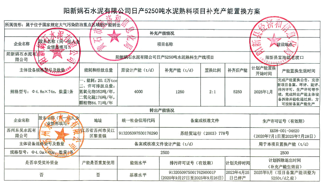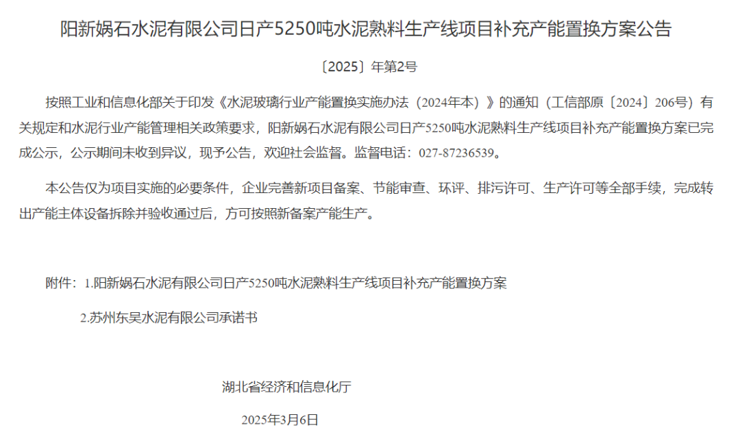 同期,湖北省經(jīng)信廳發(fā)布陽新媧石水泥有限公司日產(chǎn)5250噸水泥熟料生產(chǎn)線項目補充產(chǎn)能置換方案公告稱,按照工業(yè)和信息化部關于印發(fā)《水泥玻璃行業(yè)產(chǎn)能置換實施辦法(2024年本)》的通知(工信部原〔2024〕206號)有關規(guī)定和水泥行業(yè)產(chǎn)能管理相關政策要求,陽新媧石水泥有限公司日產(chǎn)5250噸水泥熟料生產(chǎn)線項目補充產(chǎn)能置換方案已完成公示,公示期間未收到異議,現(xiàn)予公告,歡迎社會監(jiān)督。