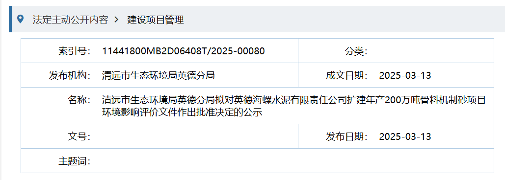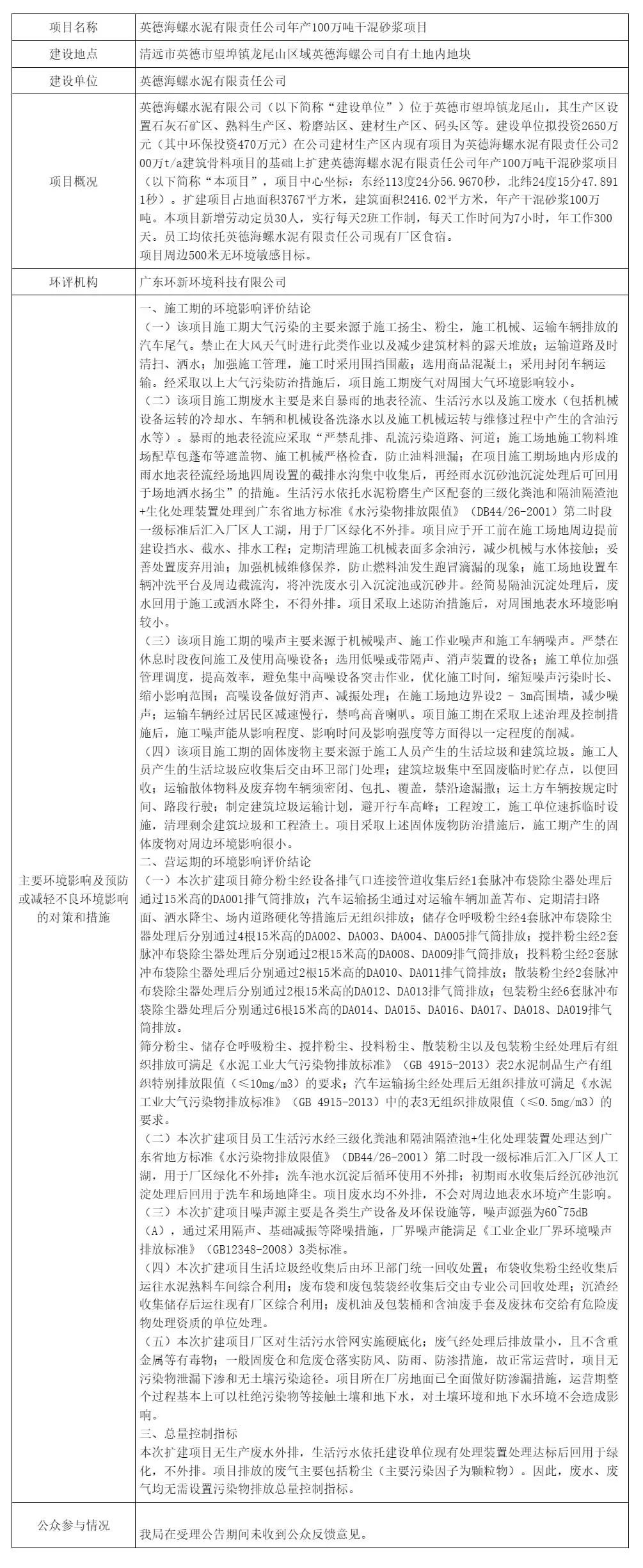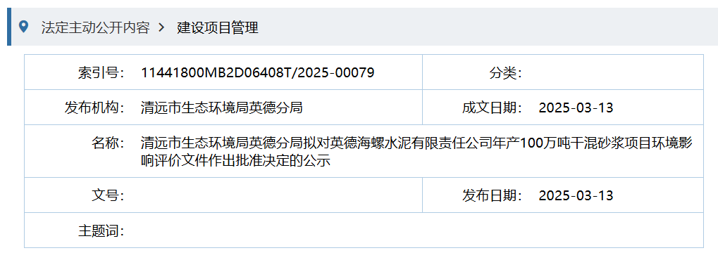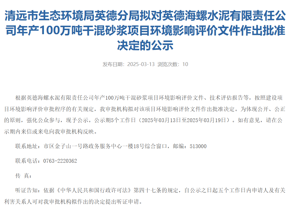 3月13日,清遠市生態(tài)環(huán)境局英德分局擬對英德海螺水泥有限責任公司年產(chǎn)100萬噸干混砂漿項目環(huán)境影響評價文件作出批準決定的公示。