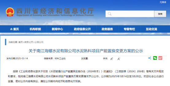 3月14日,四川省經(jīng)濟和信息化廳發(fā)布《關(guān)于南江海螺水泥有限公司水泥熟料項目產(chǎn)能置換變更方案的公示》稱:按照《工業(yè)和信息化部關(guān)于印發(fā)〈水泥玻璃行業(yè)產(chǎn)能置換實施辦法(2024年本)〉的通知》(工信部原〔2024〕206號)等有關(guān)文件規(guī)定和要求,現(xiàn)將南江海螺水泥有限公司水泥熟料項目產(chǎn)能置換方案變更情況予以公示,公示期為2025年3月14日至3月28日。歡迎社會公眾進行監(jiān)督,若對公示內(nèi)容有異議,請在公示期內(nèi)向經(jīng)濟和信息化廳反映。