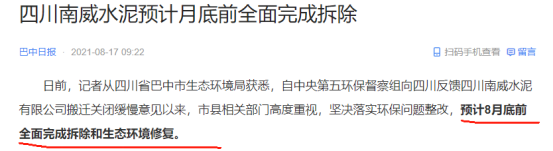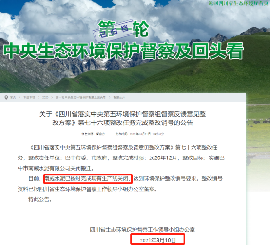 根據(jù)四川省生態(tài)環(huán)境保護督察工作領(lǐng)導小組辦公室2021年3月11日發(fā)布的關(guān)于【《四川省落實中央第五環(huán)境保護督察組督察反饋意見整改方案》第七十六項整改任務完成整改銷號的公告】顯示,截至2021年3月10日,南威水泥已按時完成現(xiàn)有生產(chǎn)線關(guān)閉,達到環(huán)境保護整改銷號要求。