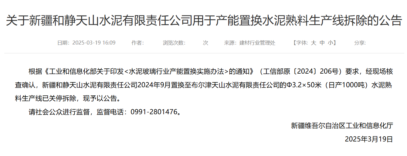 3月19日,新疆維吾爾自治區(qū)工業(yè)和信息化廳發(fā)布《關(guān)于新疆和靜天山水泥有限責(zé)任公司用于產(chǎn)能置換水泥熟料生產(chǎn)線拆除的公告》稱,根據(jù)《工業(yè)和信息化部關(guān)于印發(fā)<水泥玻璃行業(yè)產(chǎn)能置換實施辦法>的通知》(工信部原〔2024〕206號)要求,經(jīng)現(xiàn)場核查確認(rèn),新疆和靜天山水泥有限責(zé)任公司2024年9月置換至布爾津天山水泥有限責(zé)任公司的Φ3.2×50米(日產(chǎn)1000噸)水泥熟料生產(chǎn)線已關(guān)停拆除,現(xiàn)予以公告。