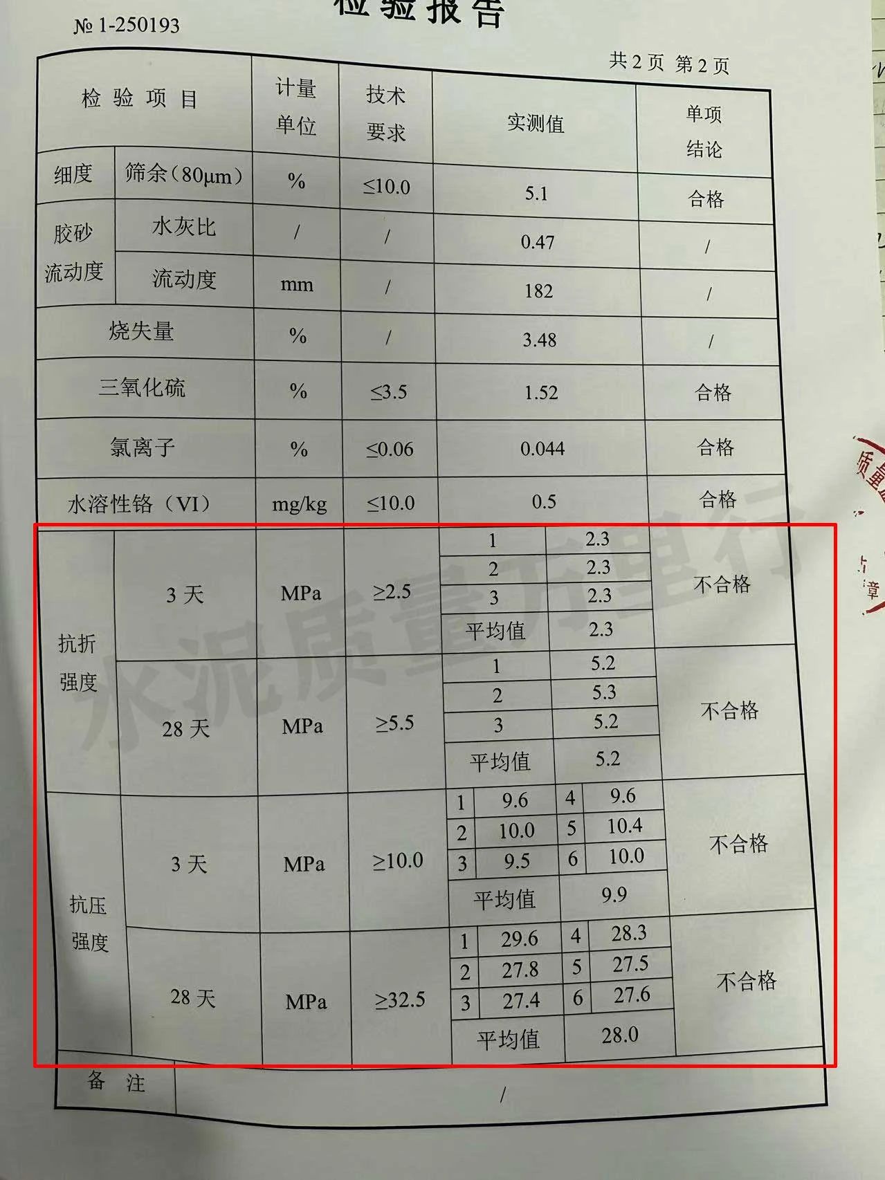為進(jìn)一步核實(shí)情況,水泥質(zhì)量萬(wàn)里行組委會(huì)工作人員在該市場(chǎng)購(gòu)買樣品并委托權(quán)威機(jī)構(gòu)檢驗(yàn)。檢驗(yàn)報(bào)告顯示,該批次水泥抗壓抗折強(qiáng)度與標(biāo)準(zhǔn)要求嚴(yán)重不符,被判定為不合格產(chǎn)品,這也證實(shí)了消費(fèi)者投訴并非空穴來(lái)風(fēng)。