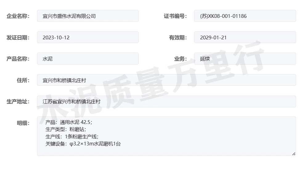 據(jù)江蘇省市場(chǎng)監(jiān)管局?jǐn)?shù)據(jù),宜興市盛偉水泥有限公司生產(chǎn)許可證,編號(hào)為(蘇)XK08-001-01186.證書(shū)有效期從2023年10月12日至2029年1月21日,生產(chǎn)地址位于江蘇省宜興市和橋鎮(zhèn)北莊村。該公司許可產(chǎn)品為通用水泥42.5.生產(chǎn)類型為粉磨站,擁有1條粉磨生產(chǎn)線,關(guān)鍵設(shè)備是1臺(tái)3.2x13m水泥磨機(jī)。企業(yè)具備生產(chǎn)能力,證后監(jiān)管卻無(wú)從保障。