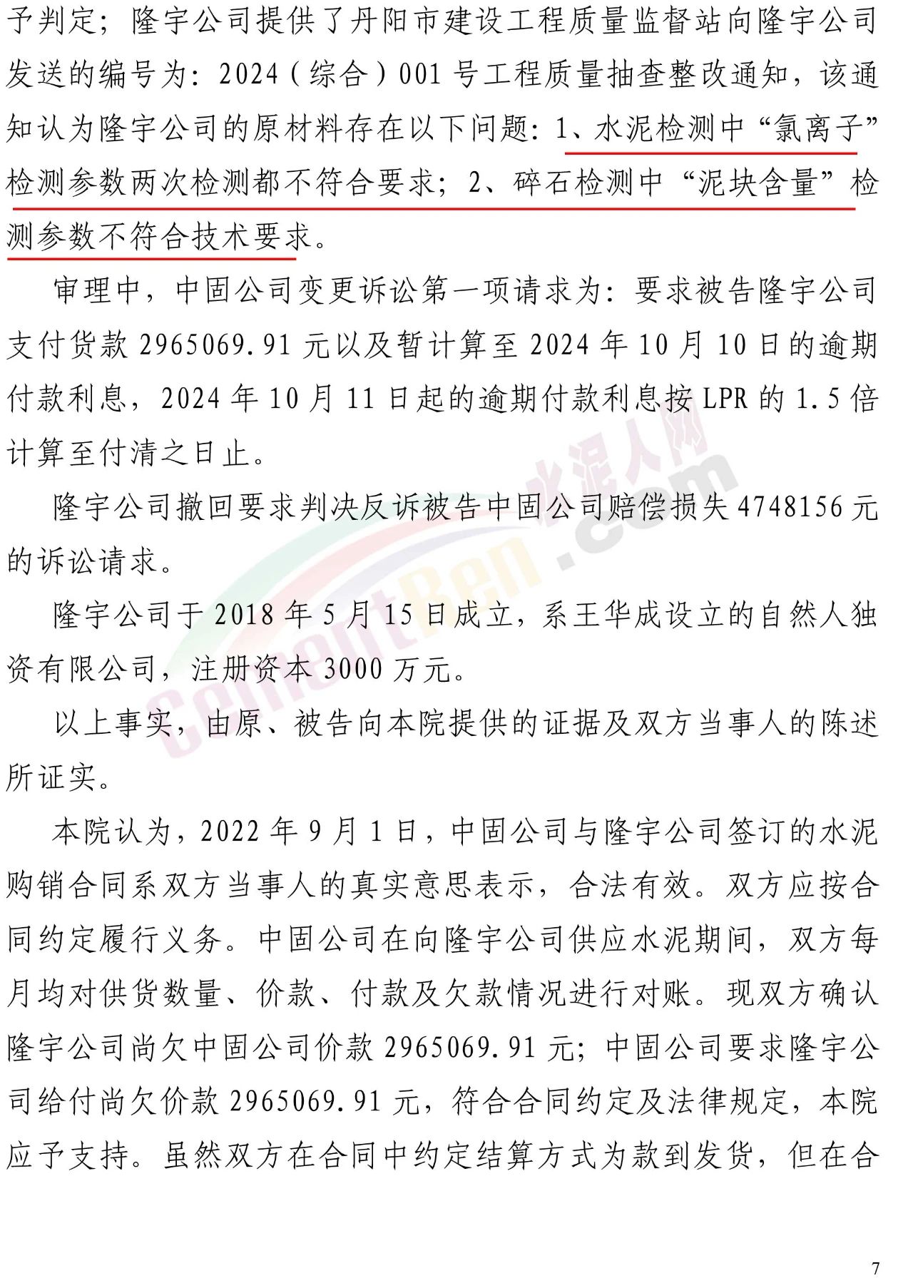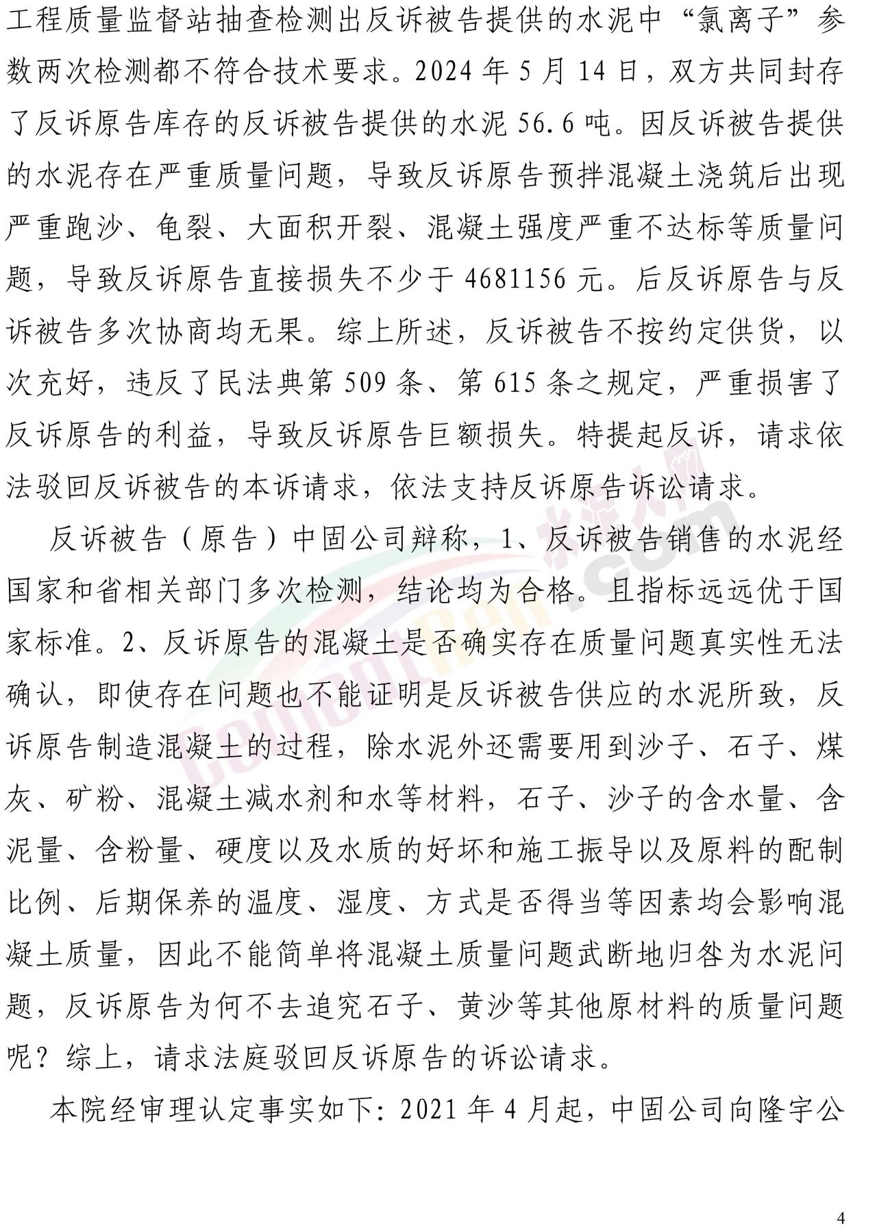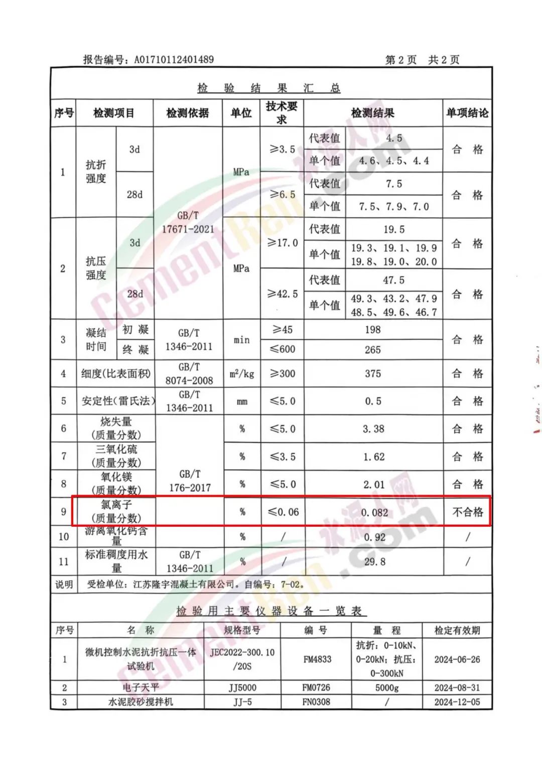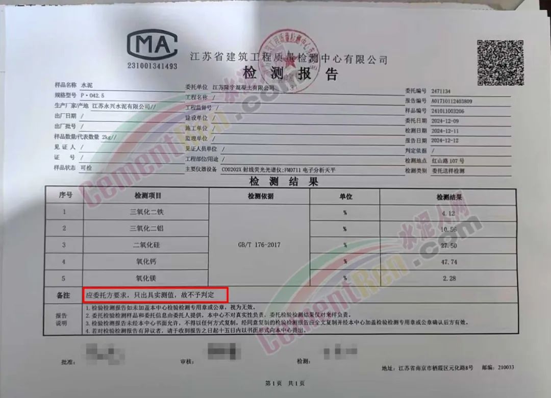 隆宇公司則提起反訴,堅稱中固公司供應(yīng)的水泥存在嚴重質(zhì)量問題(氯離子超標、強度不足),并提供了自己委托江蘇省建筑工程質(zhì)量檢測中心有限公司于2024年12月12日出具的檢測報告作為核心證據(jù)。然而,這份報告成為其敗訴的關(guān)鍵伏筆。