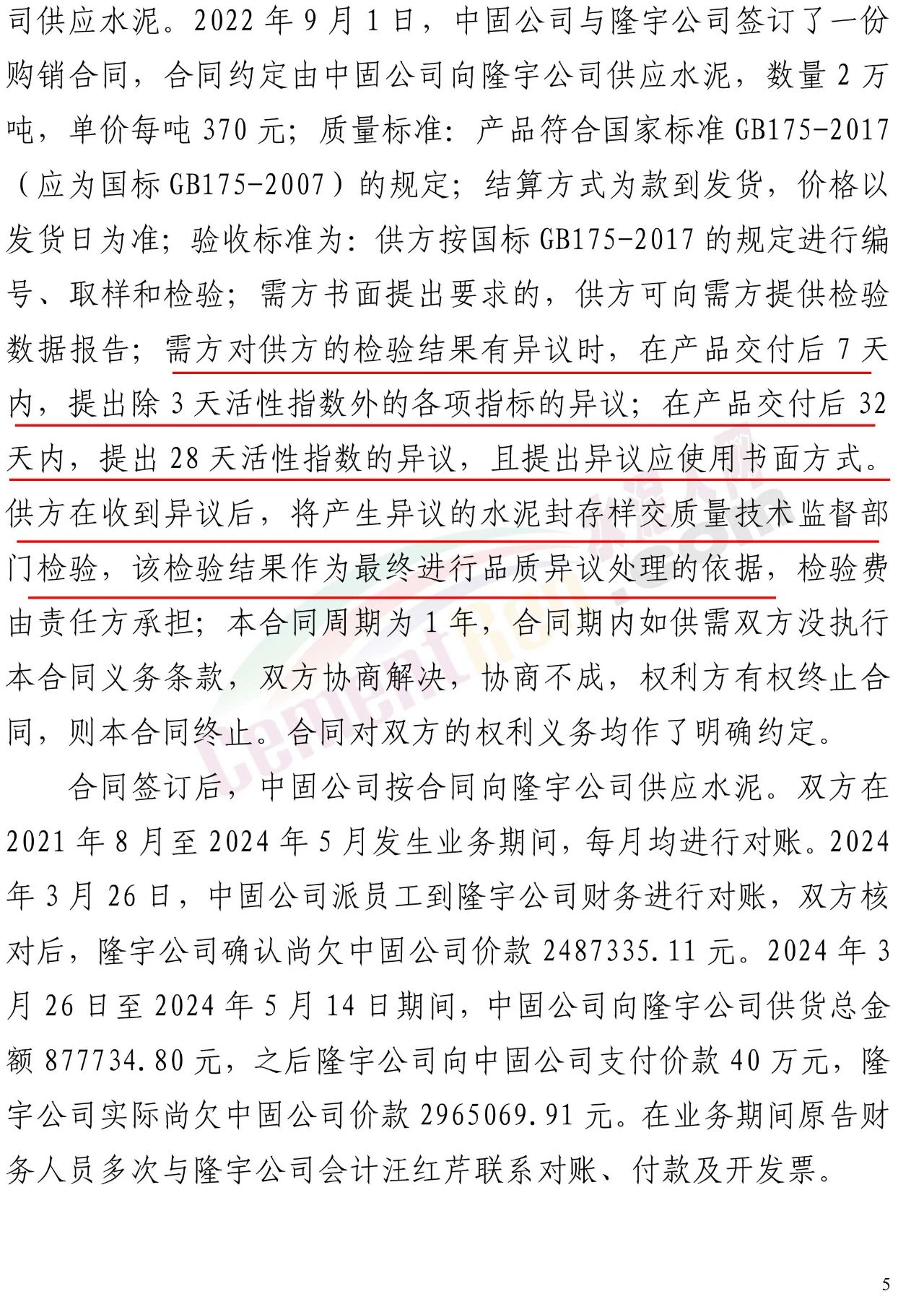案件源于2022年9月1日雙方簽訂的一份水泥購銷合同。合同約定中固公司向隆宇公司供應(yīng)水泥2萬噸,單價每噸370元,質(zhì)量標準須符合國標GB175-2007(合同原文誤寫為GB175-2017)。尤為關(guān)鍵的是,合同嚴格規(guī)定了質(zhì)量異議期:需方對供方檢驗結(jié)果有異議時,須在產(chǎn)品交付后規(guī)定時間內(nèi)以書面方式提出。供方收到異議后,應(yīng)將產(chǎn)生異議的水泥封存樣交質(zhì)量技術(shù)監(jiān)督部門檢驗,該結(jié)果作為最終處理依據(jù)。
