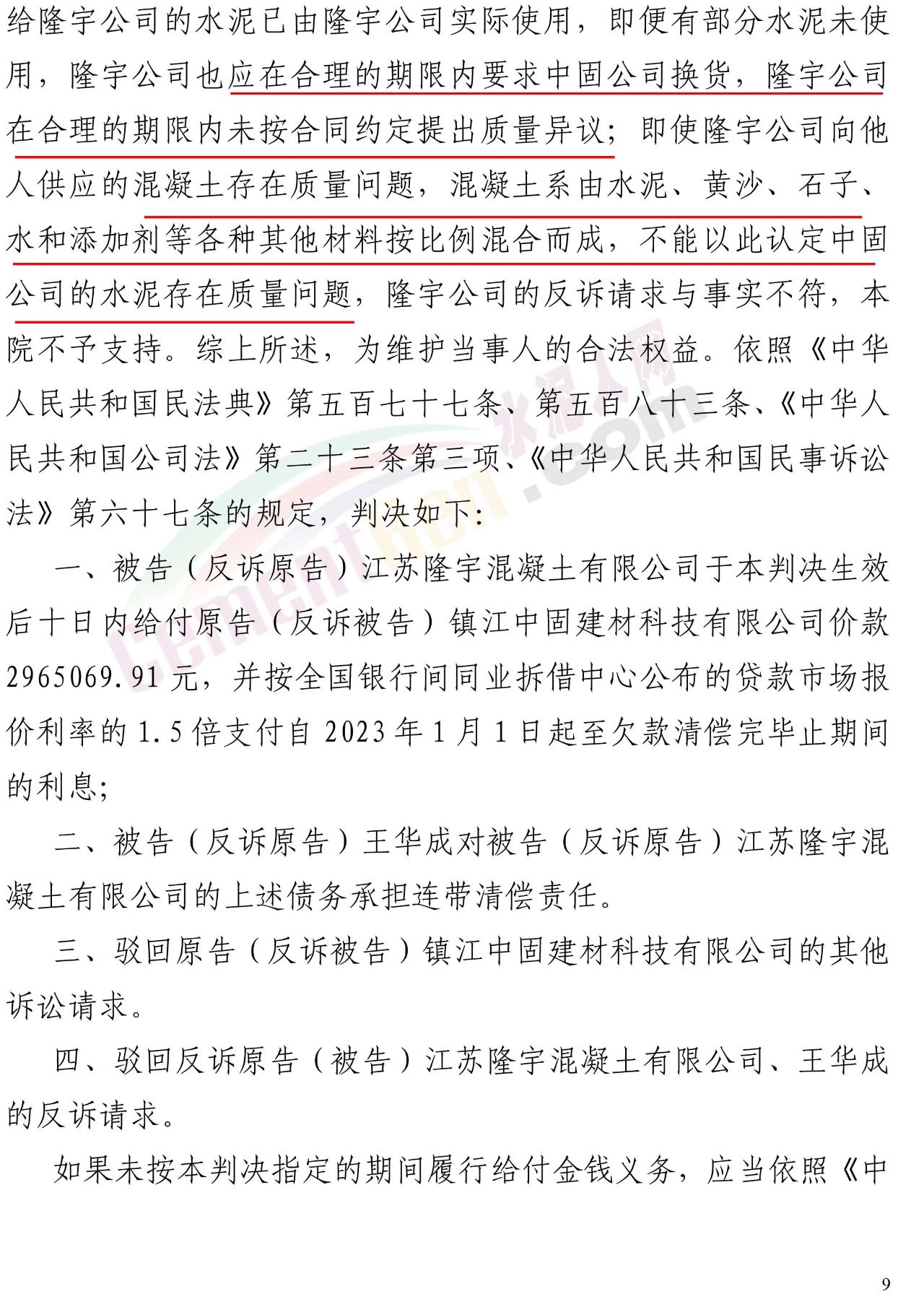 法院還駁斥了隆宇公司關(guān)于其下游混凝土質(zhì)量問題系由中固水泥造成的核心邏輯:“混凝土系由水泥、黃沙、石子、水和添加劑等各種其他材料按比例混合而成,不能僅因隆宇公司向他人供應(yīng)的混凝土存在質(zhì)量問題,就直接推定中固公司供應(yīng)的水泥存在質(zhì)量問題。”法院認為,隆宇公司的反訴請求與事實不符,缺乏充分、合法、有效的證據(jù)鏈支撐。