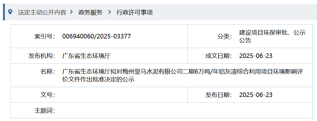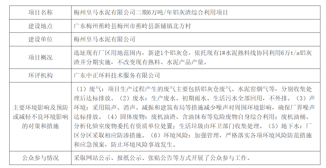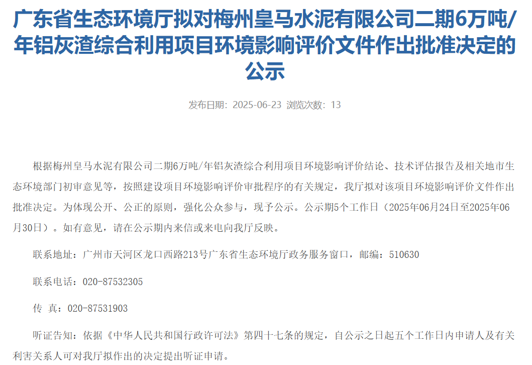 日前,廣東省生態(tài)環(huán)境廳發(fā)布擬對梅州皇馬水泥有限公司二期6萬噸/年鋁灰渣綜合利用項目環(huán)境影響評價文件作出批準決定的公示稱,根據(jù)梅州皇馬水泥有限公司二期6萬噸/年鋁灰渣綜合利用項目環(huán)境影響評價結論、技術評估報告及相關地市生態(tài)環(huán)境部門初審意見等,按照建設項目環(huán)境影響評價審批程序的有關規(guī)定,廣東省生態(tài)環(huán)境廳擬對該項目環(huán)境影響評價文件作出批準決定。為體現(xiàn)公開、公正的原則,強化公眾參與,現(xiàn)予公示。公示期5個工作日(2025年06月24日至2025年06月30日)。項目為在現(xiàn)有廠區(qū)用地范圍內(nèi),新建1個鋁灰倉,依托現(xiàn)有1號水泥熟料線協(xié)同利用6萬t/a鋁灰渣并分期實施,不改變現(xiàn)有熟料、水泥產(chǎn)品產(chǎn)量。
