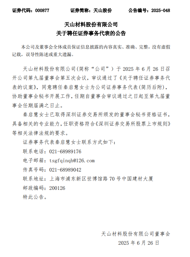天山股份6月26日晚間發(fā)布公告稱(chēng),公司審議通過(guò)了《關(guān)于聘任證券事務(wù)代表的議案》,同意聘任秦啟慧女士為公司證券事務(wù)代表,協(xié)助董事會(huì)秘書(shū)開(kāi)展工作。