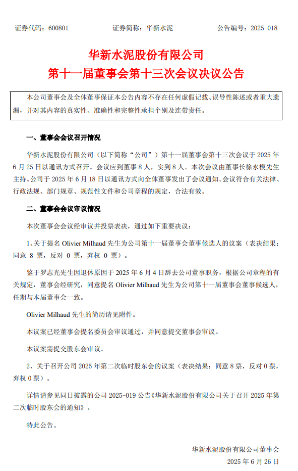 6月25日,華新水泥發(fā)布公告稱(chēng),經(jīng)公司董事會(huì)會(huì)議審議并投票表決,選舉Olivier Milhaud為公司第十一屆董事會(huì)董事,任期與本屆董事會(huì)一致。根據(jù)公告,Olivier Milhaud,法國(guó)籍,1962年9月出生,巴黎埃塞克商學(xué)院碩士。
