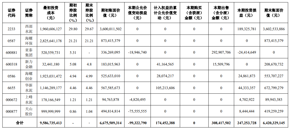 水泥人網(wǎng)注意到,海螺水泥2024年度報(bào)告中披露,海螺水泥除持有西部水泥股份外,還持有亞泰集團(tuán)、華新水泥、上峰水泥、天山股份等企業(yè)股份,西部水泥為其持股比例最大的同行企業(yè)。