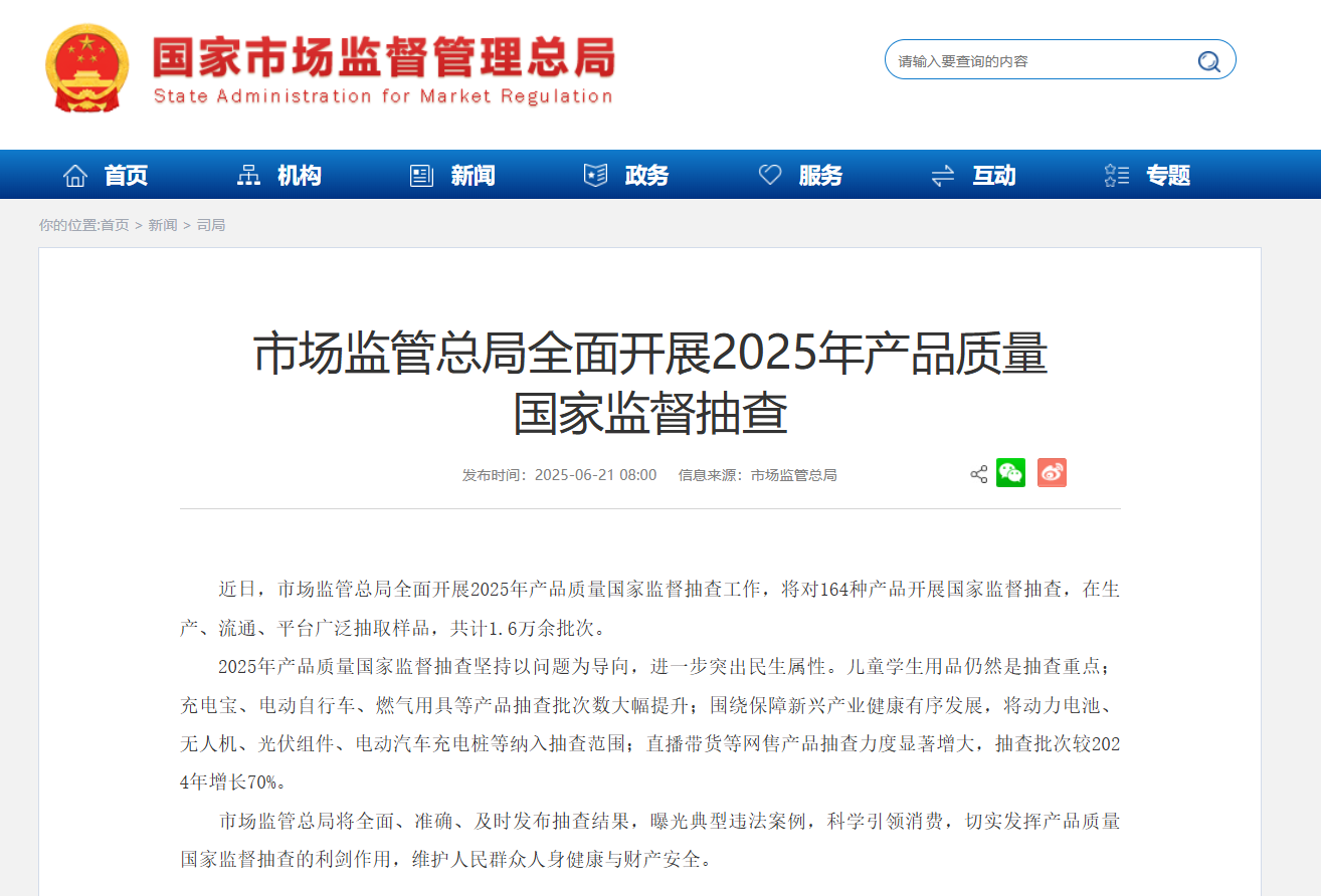 近日,市場(chǎng)監(jiān)管總局全面開展2025年產(chǎn)品質(zhì)量國家監(jiān)督抽查工作,將對(duì)164種產(chǎn)品開展國家監(jiān)督抽查,在生產(chǎn)、流通、平臺(tái)廣泛抽取樣品,共計(jì)1.6萬余批次。市場(chǎng)監(jiān)管總局將全面、準(zhǔn)確、及時(shí)發(fā)布抽查結(jié)果,曝光典型違法案例,科學(xué)引領(lǐng)消費(fèi),切實(shí)發(fā)揮產(chǎn)品質(zhì)量國家監(jiān)督抽查的利劍作用,維護(hù)人民群眾人身健康與財(cái)產(chǎn)安全。